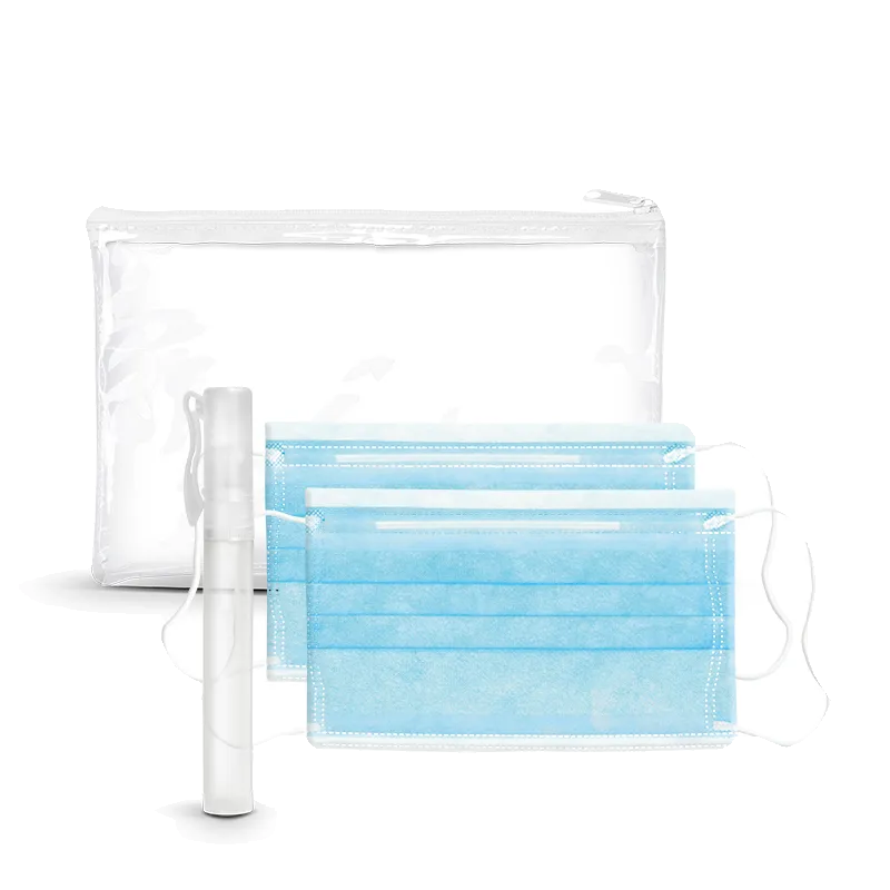 PROTEGEZ VOUS / DESINFECTEZ VOUS / ANTI-COVID Utile et pratique, dans une pochette élégante, transparente ou translucide zippée blanc, vous trouverez 2 masques chirurgicaux 3 plis, à usage unique type I, norme EN 14683, anti-Covid, et le VAPOO10, vaporisateur avec 9ml de solution hydroalcoolique fabriquée en France. Marquage en 1 couleur sur la pochette.