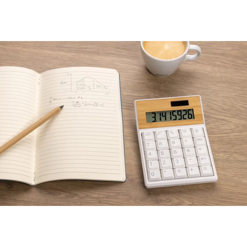 Calculatrice à 8 chiffres fabriquée en ABS recyclé certifié RCS et bambou FSC® 100% . Teneur totale en matières recyclées : 70% selon le poids total de l'article. La certification RCS garantit une chaîne d'approvisionnement entièrement des matériaux reyclées. Fonctionne avec des piles ou via énergie solaire.