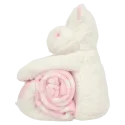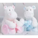 L'hippopotame est recouvert d'une fourrure blanche toute douce avec de petites touches de bleu ou de rose pour convenir aux tout-petits ou à un nouveau-né. Un doudou couverture moelleux, orné de jolis pois, enroulé et tenu sous les bras de l'hippopotame est parfait pour y broder ou imprimer des noms.