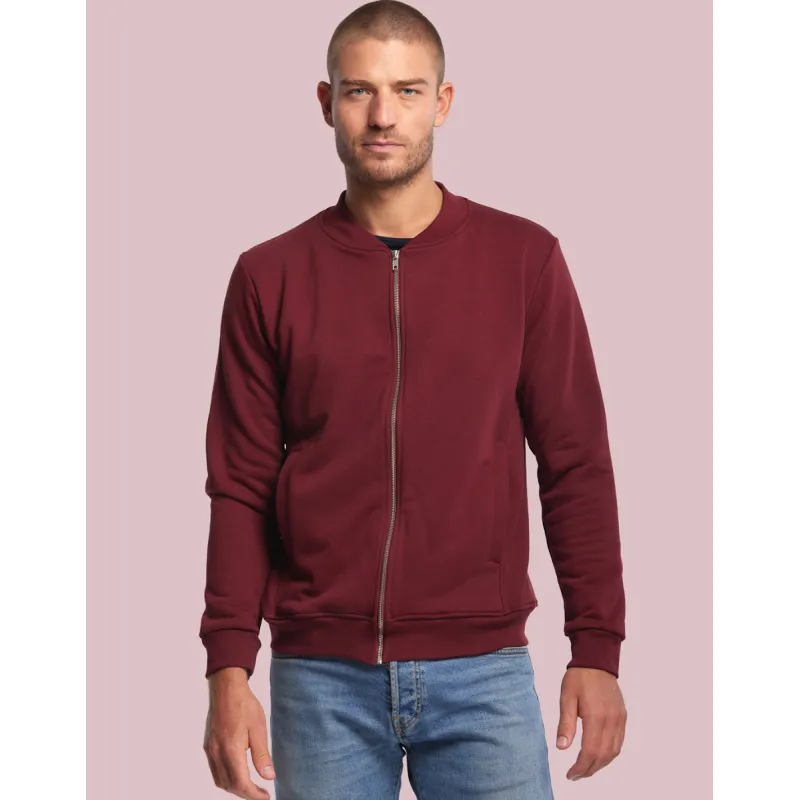 Blouson Made in France façon Teddy. 80% coton biologique certifié OCS, 20% polyester recyclé. 2 poches mains passepoilées. Matière Terry 350g/m² lavée, non grattée pour éviter le boulochage + traitement silicone pour améliorer la longévité du vêtement. Col en demi lune. Double piqure en bas de veste. Bande de propreté au col. Zip central YKK. Disponible sur stock et livré sous 24/48h sans personnalisation, coloris disponibles : Blanc, Marine, Noir, Bordeaux, Vert Bouteille, Vert Bouteille, Gris Chiné Clair, Gris Chiné Foncé dans les tailles XS, S, M, L, XL, 2XL, 3XL