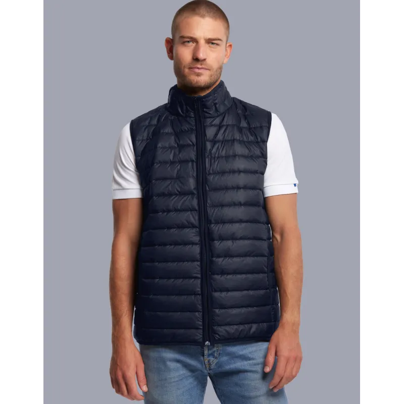 Doudoune sans manches Homme Made in France, fabriquée dans l'Oise. Coupe droite. Extérieur en polyester dont 30% de polyester recyclé, garnissage vegan en polyester. Matelassage fin. Coupe droite. Poches mains passepoilées. 2 poches intérieures plaquées. Zip central YKK imperméable. Disponible sur stock et livré sous 24/48h sans personnalisation, coloris disponibles : Noir, Marine dans les tailles S, M, L, XL, 2XL, 3XL, 4XL