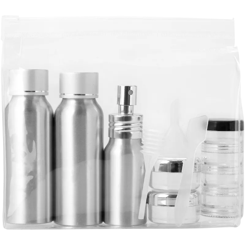 Cette trousse de toilette contient 2 bouteilles en aluminium 80ml, un vaporisateur 30 ml, deux petits pots, un pot avec 4 logements, une spatule, un entonnoir et une poire. Les bouteilles et l'entonnoir, etc. sont emballés dans une pochette plastique, séparés de la pochette. Marquage indisponible sur les composants.