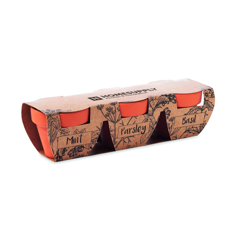 Ensemble de 3 pots en terre cuite comprenant 3 graines différentes de 3 herbes différentes : menthe, persil et basilic. Fabriqué en UE.