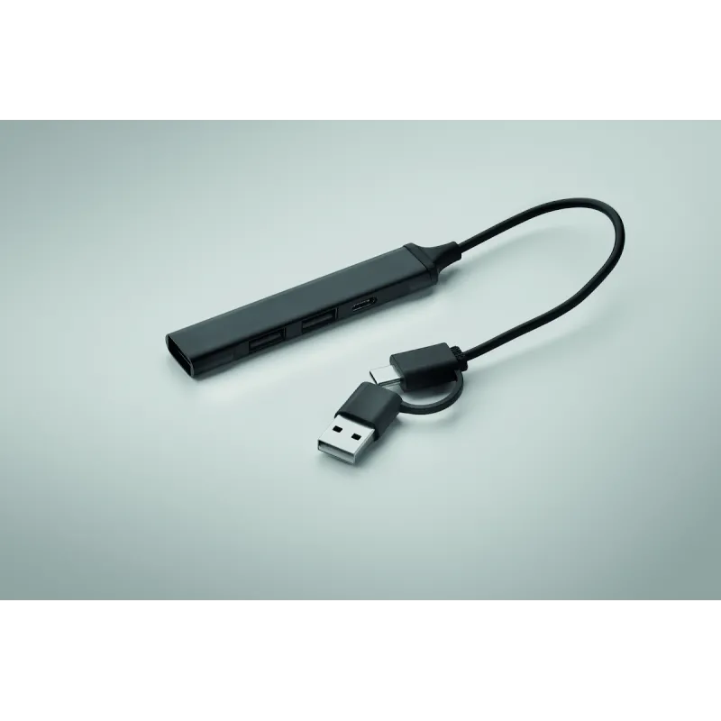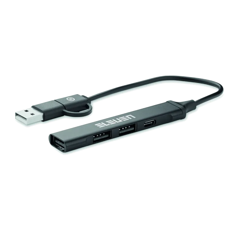 Hub USB 4 ports en aluminium recyclé. 3 USB-A + 1 Type-C. Entrée : 2-en-1 Type-C & Type-A. Longueur du câble : 19 cm.