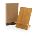 Support de téléphone en bambou certifié FSC® 100. Le support est doté d'un trou permettant de connecter un câble de chargement afin de pouvoir recharger facilement le téléphone tout en utilisant le support. Emballé dans une boîte kraft FSC mix qui passe facilement dans la boîte aux lettres.