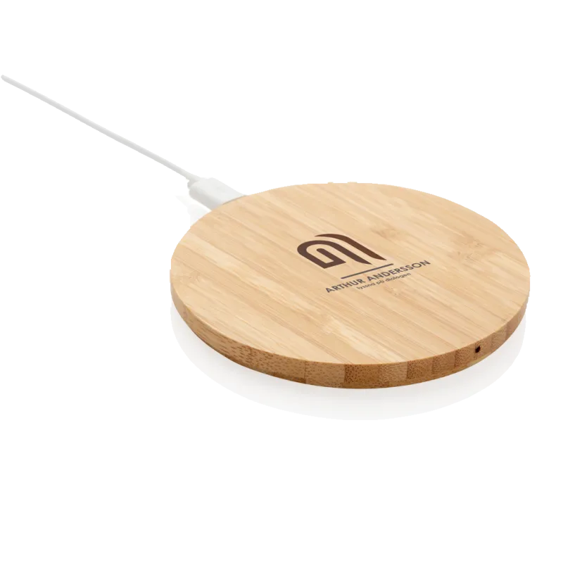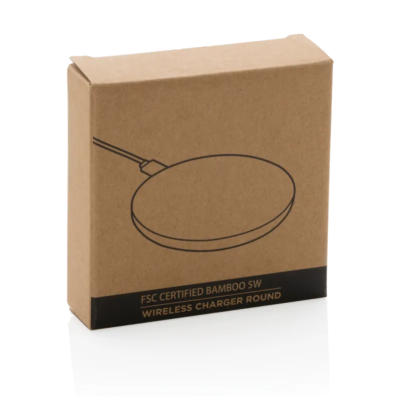 Chargeur sans fil de 5W en bambou certifié FSC® 100%. Compatible avec tous les appareils compatibles QI comme Android dernière génération, Iphone 8 et plus. Entrée: 5V/2A. Induction : 5V/1A - 5W. Article et accessoires 100% sans PVC. Emballé dans une boite FSC®Mix. Câble micro USB en TPE recyclé RCS de 150 cm inclus.