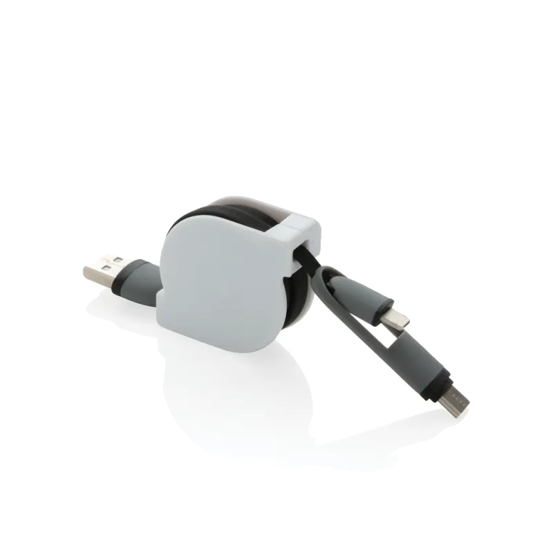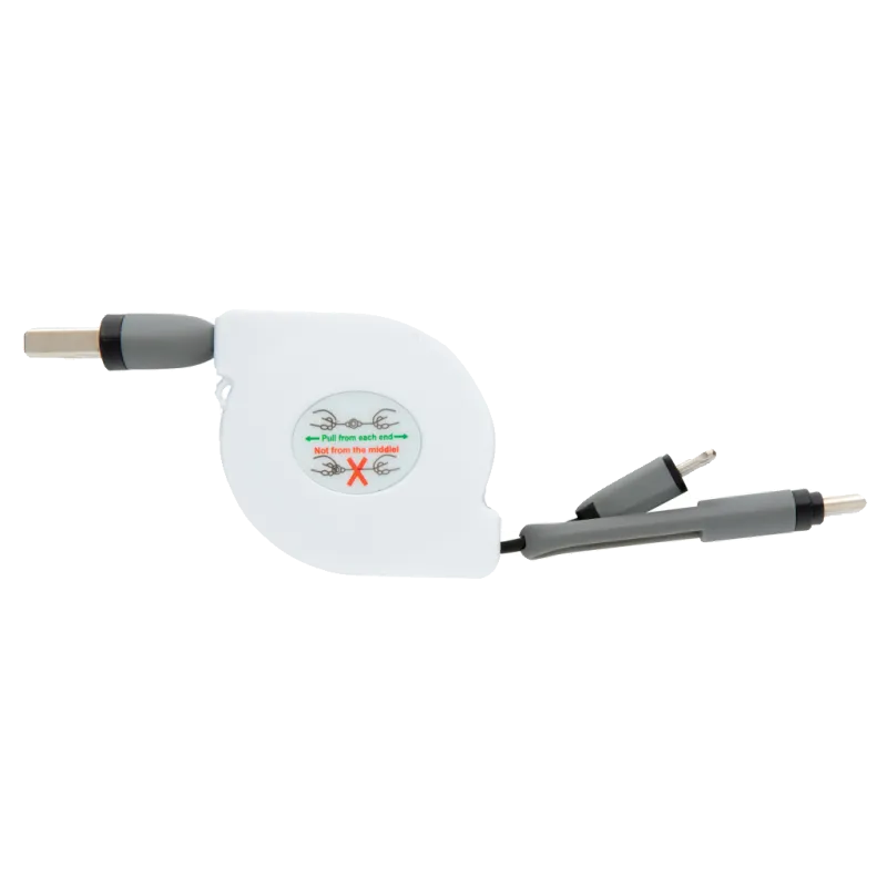 Câble de charge compact et rétractable 3 en 1 avec type C et connexion double pour IOS et Android qui nécessitent le micro USB. Grace à son mécanisme rétractable, le câble plat de 100cm peut facilement être emmené n'importe où sans s'emmêler. Boitier en ABS avec câble en TPU. Synchronisation possible.