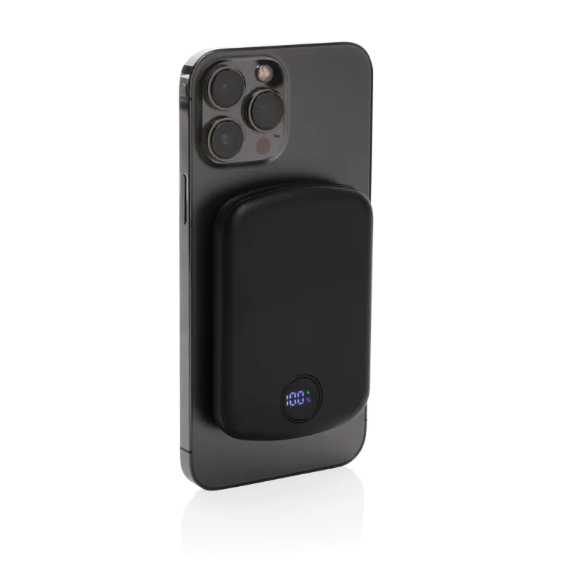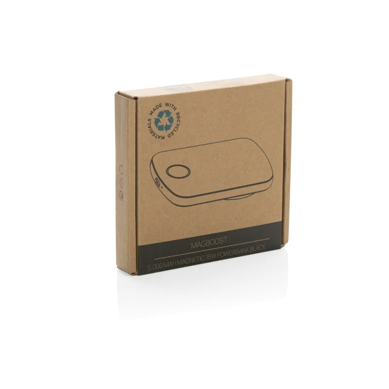 Batterie de secours 5000 mAh avec chargeur magnétique sans fil de 15W dont le boîtier est fabriqué en plastique ABS recyclé certifié RCS. RCS (Recycled Claim Standard) est une norme qui permet de vérifier le contenu recyclé d'un produit tout au long de la chaîne d'approvisionnement. Contenu recyclé total : 21 % sur la base du poids total de l'article. Le powerbank contient une batterie lithium-polymère longue durée de grade A de 5 000 mAh. L'écran LED numérique intégré indique le niveau d'énergie restant pour que vous sachiez toujours quand recharger. ; Entrée Type-C 5V/2,4A ; Sortie Type C:5V/2A.4A L'article et les accessoires sont exempts de PVC. Câble de recharge en TPE recyclé certifié RCS inclus. Emballé dans un emballage FSC® mix. Entrée Type-C : 5V/3A 9V/2A 12V/1,5A ; Sortie : Sortie USB-C : 5V/2,4A,9V/2,22A,12V/1,67A ; Sortie sans fil : 15W
