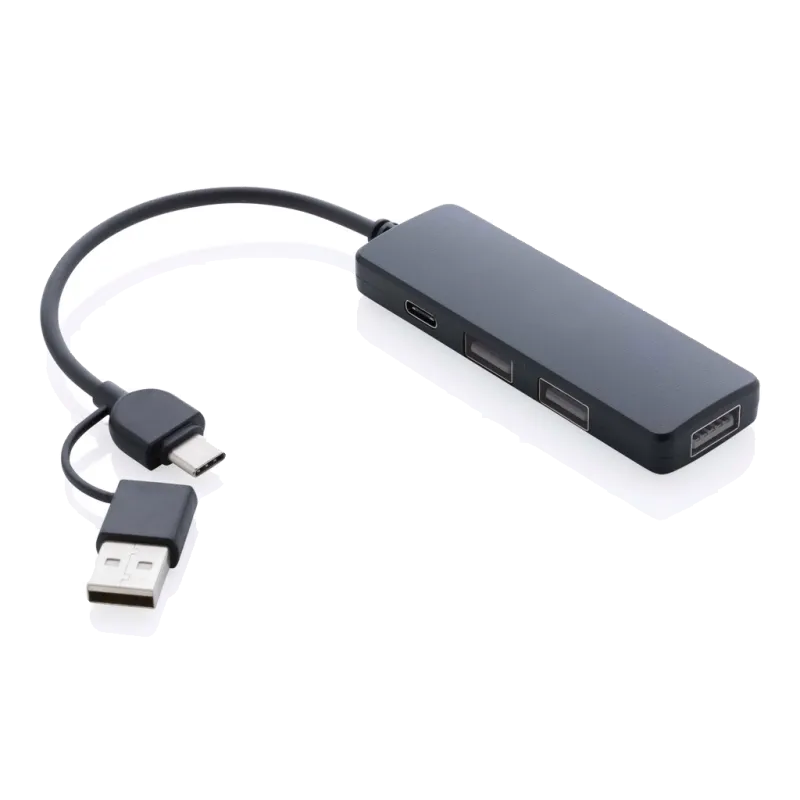 Hub USB avec boîtier fabriqué à partir de plastique ABS 100% recyclé selon la norme RCS. RCS (Recycled Claim Standard) est une norme permettant de vérifier le contenu recyclé d'un produit tout au long de la chaîne d'approvisionnement. Contenu recyclé total : 50 % sur la base du poids total de l'article. Avec 3 ports USB A 2.0 et 1 port de type C, le hub dispose d'un câble intégré de 8,5 cm en TPE 100% recyclé et certifié RCS. Avec un double connecteur d'entrée, il convient aussi bien aux ordinateurs de type C qu'à ceux de type A. Article et accessoires 100% sans PVC. Emballé dans un emballage mixte FSC.