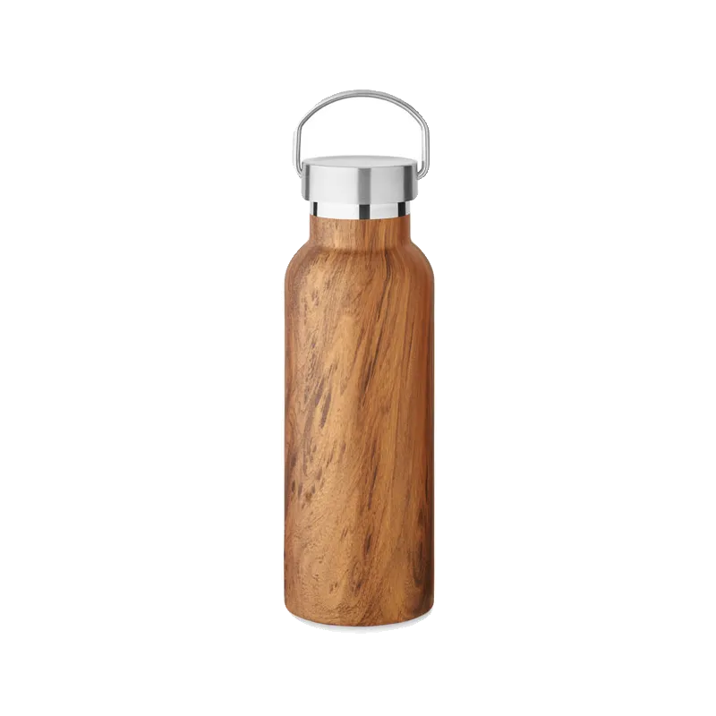 Bouteille isolante à double paroi en acier inoxydable recyclé (90 % d'acier inoxydable recyclé et 10 % d'acier inoxydable) aspect bois et bouchon poignée de transport. Anti fuite. Capacité : 500 ml.