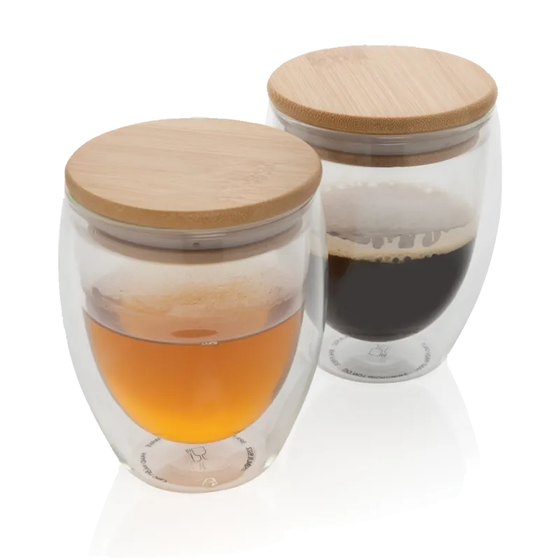 Set de 2 verres 250ml à double paroi en verre borosilicate et avec un couvercle en bambou. Lavage à la main. Sans BPA. Livré dans un coffret cadeau personnalisé.