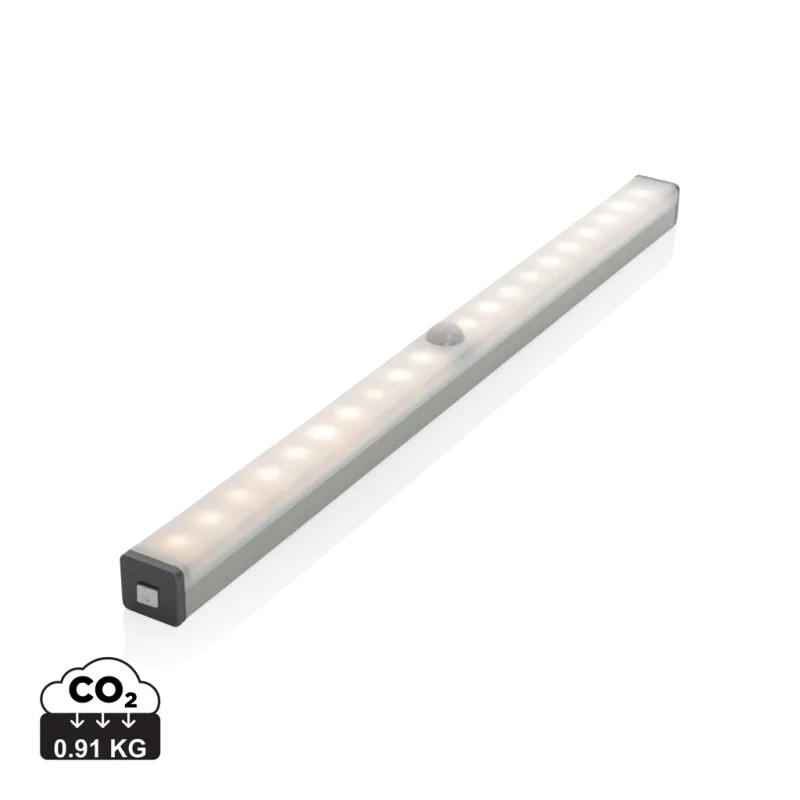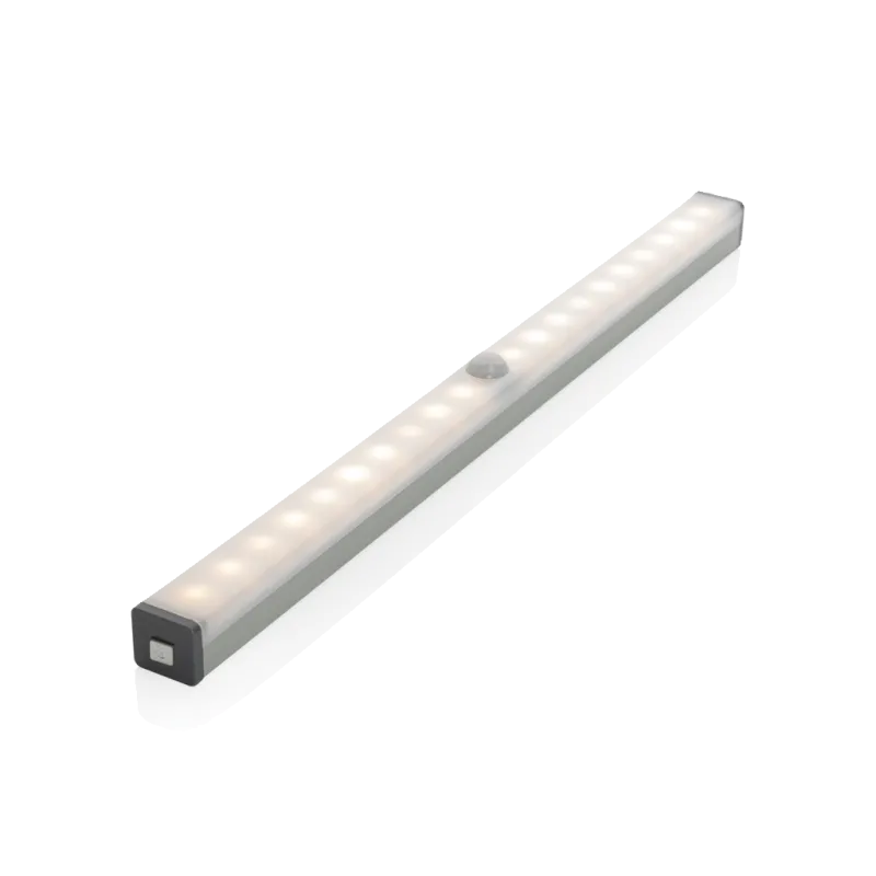 Détecteur de mouvement en aluminium avec 20 LED (30 lumens) avec une batterie 500 mAh pour une utilisation continue jusqu'à 3,5 heures et une distance de détection jusqu'à 3 mètres. Dos magnétique pour le fixer aux surfaces métalliques et avec 2 aimants autocollants inclus pour le fixer aux surfaces non magnétiques. La lumière LED s'allume lorsqu'elle détecte un mouvement et s'éteint après 35 secondes si aucun mouvement n'est plus détecté.. Rechargeable par USB avec le câble micro USB sans PVC inclus.