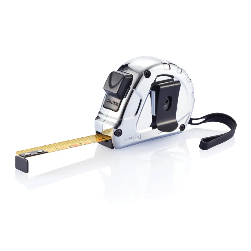 Mètre économique 5m/19mm autobloquant avec boîtier en ABS finition chromée avec autocollant et ruban jaune, homologation ECII et poinçon. Bouton d’arrêt noir, dragonne, clip ceinture en acier inoxydable.