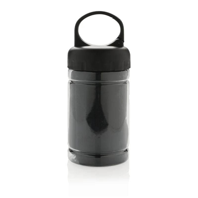 Serviette sport (85 x 30cm) rafraichissante en microfibre sans aucun produits chimiques et avec protection UV50+ qui filtre jusqu’à 98% des UVs. Trempez-la simplement dans la bouteille avec de l’eau, secouez-la, pour qu’elle retrouve en quelques secondes sa fraîcheur. La bouteille est en PP avec une couverture en ABS et un mousqueton.